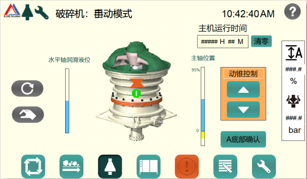 · 啟動液壓系統提升動錐,擴大排礦口;